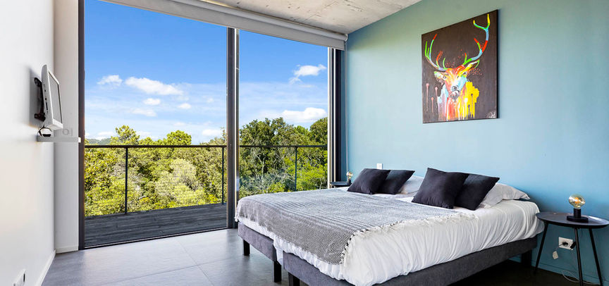 La villa se compose de trois chambres avec baies vitrées qui s'ouvrent chacune sur une terrasse privée avec une vue plongeante sur la nature.