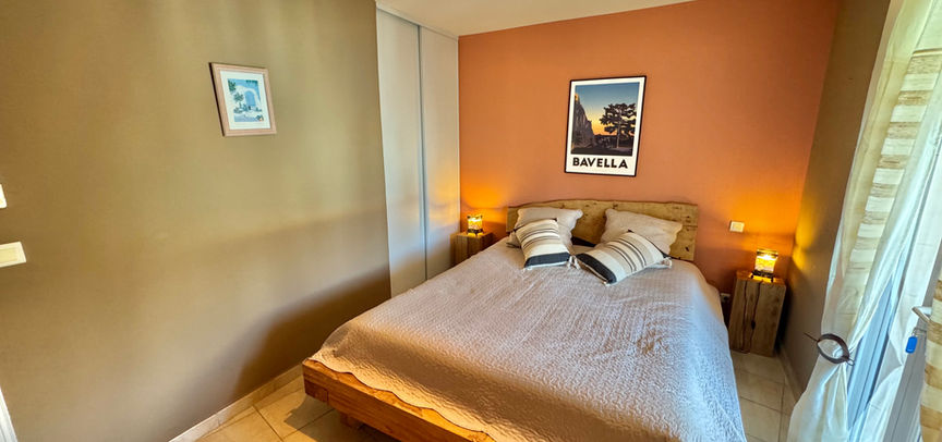Suite parentale : Lit 160x200, placard, baie vitrée avec accès terrasse et piscine